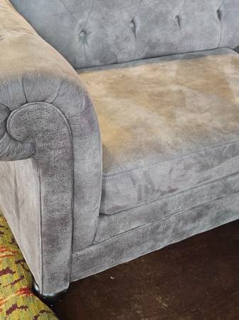 Gray couch, tufted back, very CLEAN. Like NEW!!! Measurements- about 93" long, 39" deep, 36" tall. No Stains NO Tears Covers are removable on cushions (2) and cushions are reversible